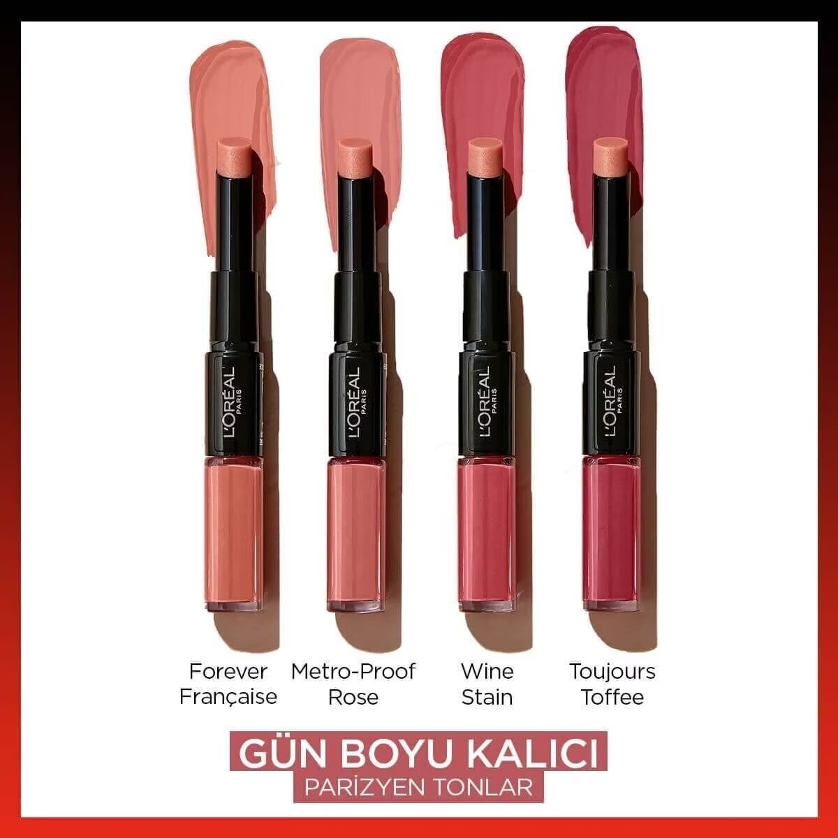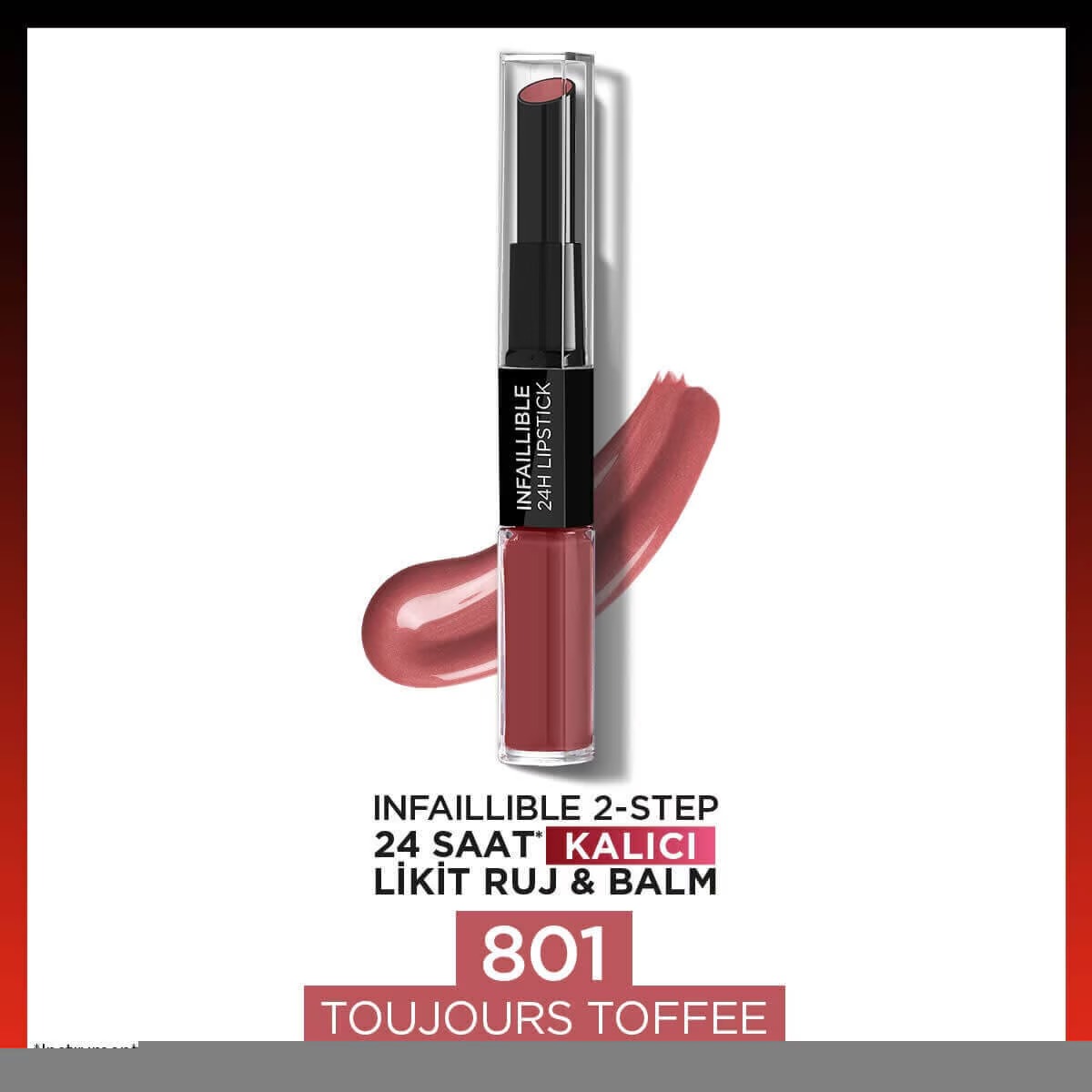 رژ لب مایع بادوام ۲۴ ساعته لورآل پاریس مدل Infaillible 2 Step شماره ۸۰۱ رنگ تافی با فرمول سبک و مقاوم، پوشش یکنواخت و مات به لبها میدهد و ماندگاری طولانی تا ۲۴ ساعت دارد. این محصول خشکی لب را کاهش داده و رنگی طبیعی و جذاب ایجاد میکند.